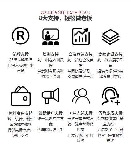 6600多個銷售服務網點已遍布全國,系統的品牌營銷支持、健全的“輔導式”營銷模式、豐富的渠道管理模式 及經驗、完善的售后服務體系、每年2-4次全國營銷峰會,30次以上區域培訓交流峰會,確保加盟客戶能夠 零基礎上手,共同開創超人新格局!